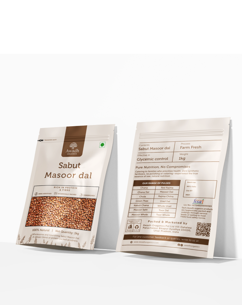 At Awadh Organics, we are committed to providing you with the highest quality Masoor Dal, Moong dal, Khapli Atta straight from our farms to your table. With every spoonful of this, you can taste the purity, freshness, and goodness of organic farming.